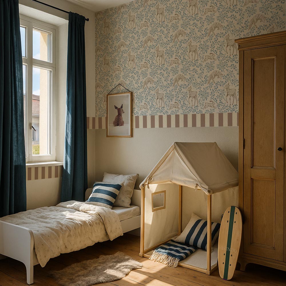 Materiał, którego używamy do produkcji tapet to gruby papier z recyklingu. Ekologiczny, świetny jakościowo, a do tego wyjątkowo łatwy w montażu. Ekologia jest dla nas bardzo ważna, gdyż nasze tapety montowane są w pokojach maluszków, dlatego materiał musi być bezpieczny i jak najbardziej naturalny.