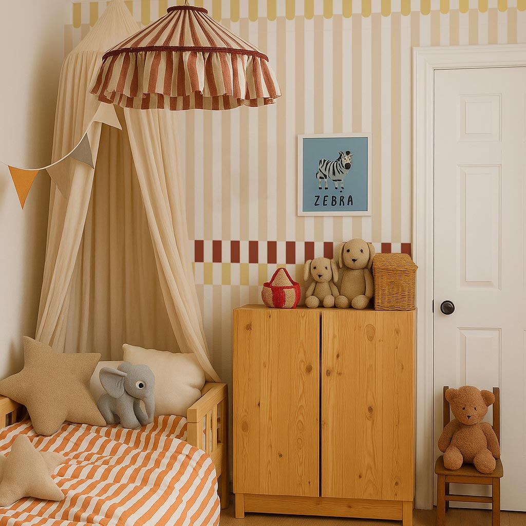 Szerokośc pasków na tapecie to 5 cm, a dwukorowy żółto-czerwony "border" jest poprowadzony dokładnie na środku wysokości tapety.